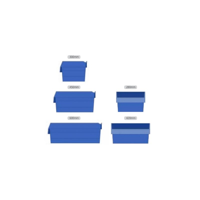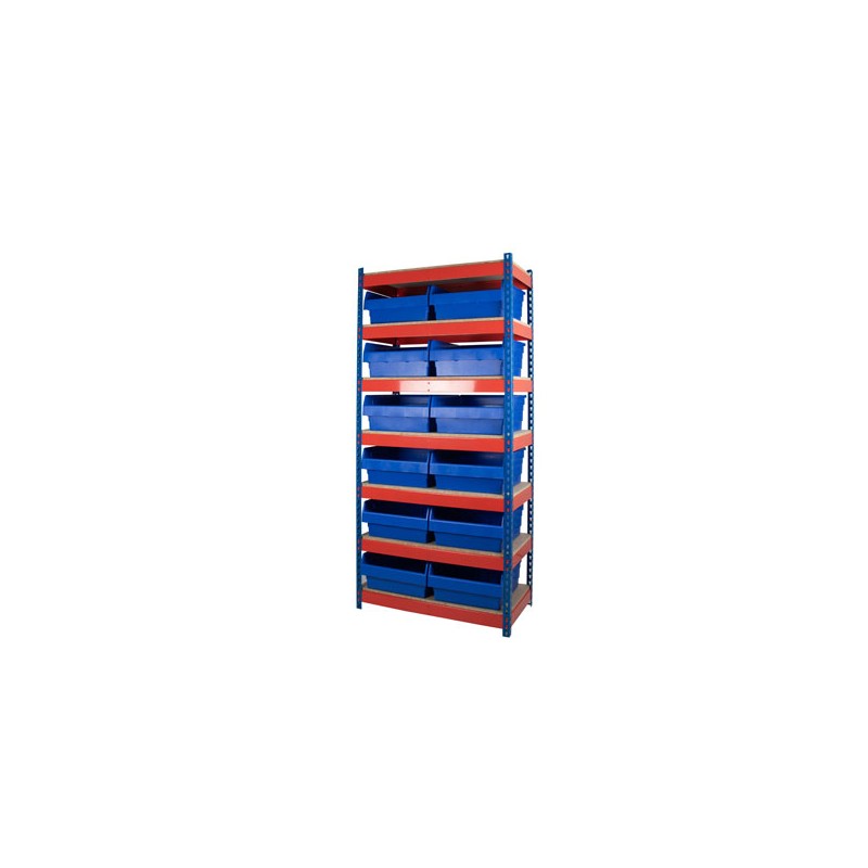 This product includes Rivet Racking bay with 7 shelf levels and 12 no. 420mm wide shelf bins